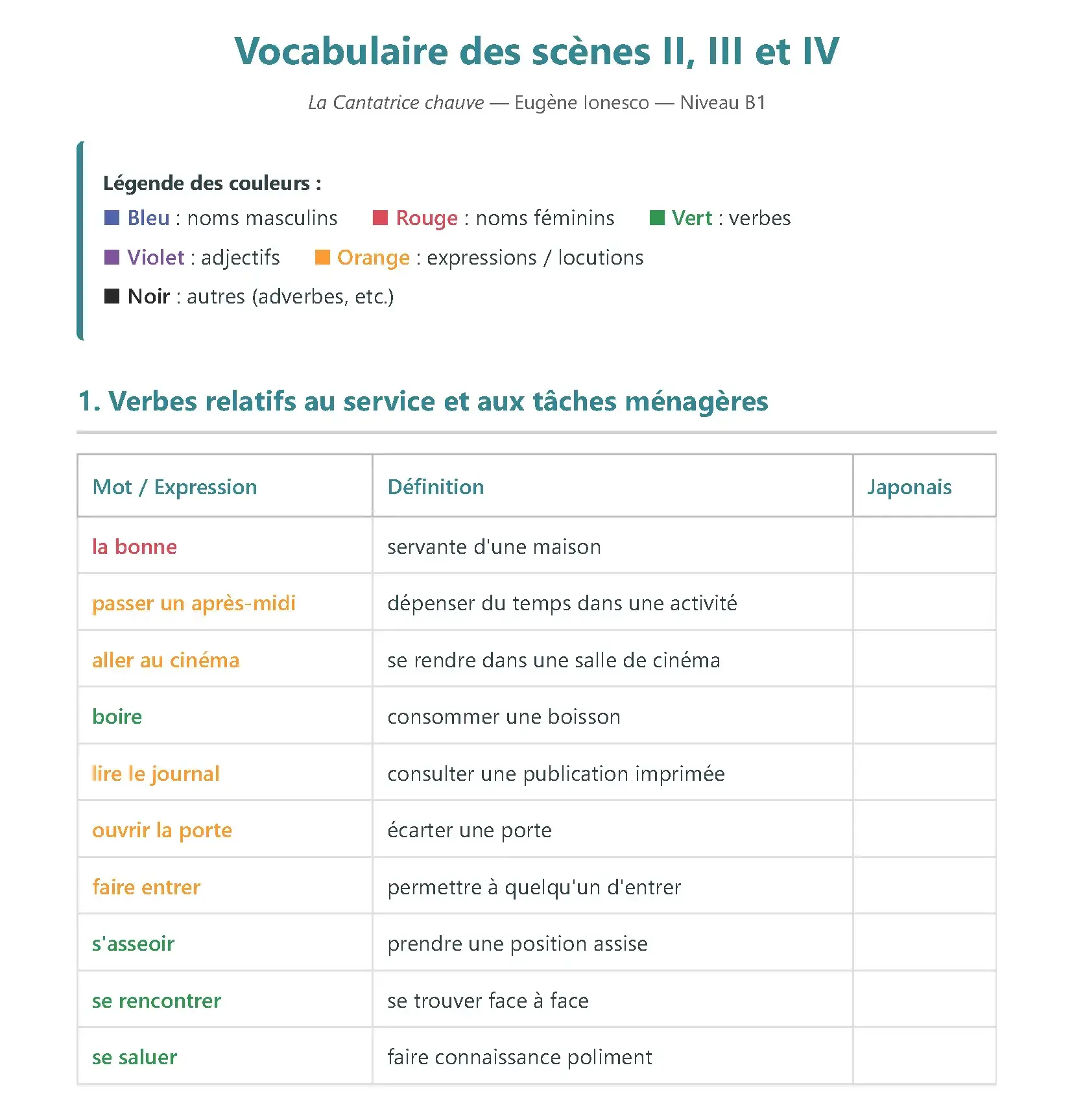 Intérieur bourgeois anglais, avec des fauteuils anglais. Soirée anglaise. M. Smith, Anglais, dans son fauteuil et ses pantoufles anglais, fume sa pipe anglaise et lit un journal anglais, près d'un feu anglais. Il a des lunettes anglaises, une petite moustache grise, anglaise. À côté de lui, dans un autre fauteuil anglais, Mme Smith, Anglaise, raccommode des chaussettes anglaises. Un long moment de silence anglais. La pendule anglaise frappe dix-sept coups anglais.